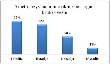 5 metų išgyvenamumo tikimybė sergant krūties vėžiu /skirtingose stadijose